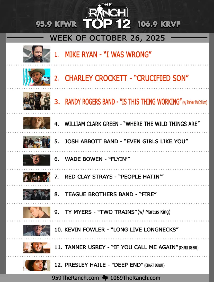 Join Heather Anderson every Sunday from 9-10 AM as she counts down the Top 12 songs each week on the Ranch Music Chart brought to you by Insurance 4 U 4 Less. 106.9 The Ranch is your home for Texans, Outlaws and Legends and this show highlights the biggest and the best of The Ranch playlist each week.