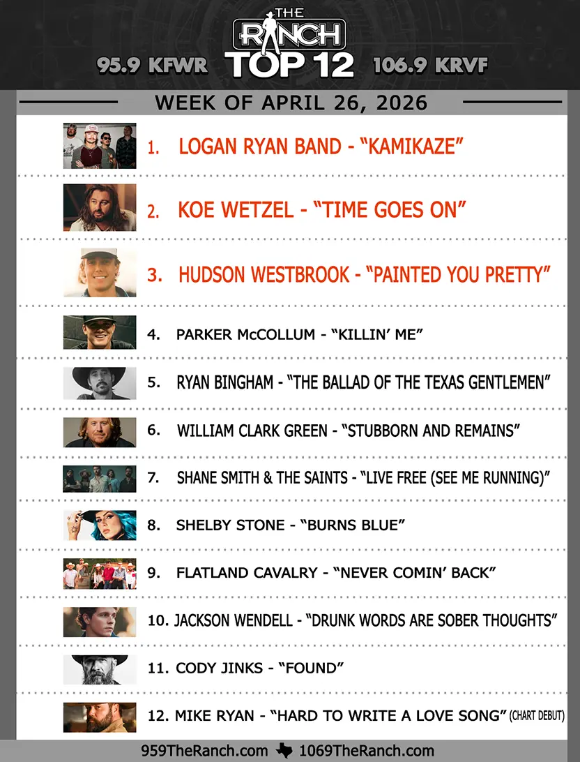 Join Heather Anderson every Sunday from 9-10 AM as she counts down the Top 12 songs each week on the Ranch Music Chart brought to you by Insurance 4 U 4 Less. 106.9 The Ranch is your home for Texans, Outlaws and Legends and this show highlights the biggest and the best of The Ranch playlist each week.