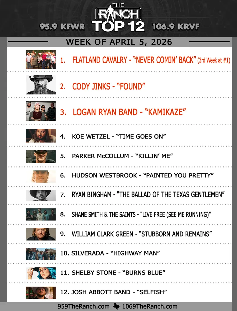 Join Heather Anderson every Sunday from 9-10 AM as she counts down the Top 12 songs each week on the Ranch Music Chart brought to you by Insurance 4 U 4 Less. 106.9 The Ranch is your home for Texans, Outlaws and Legends and this show highlights the biggest and the best of The Ranch playlist each week.