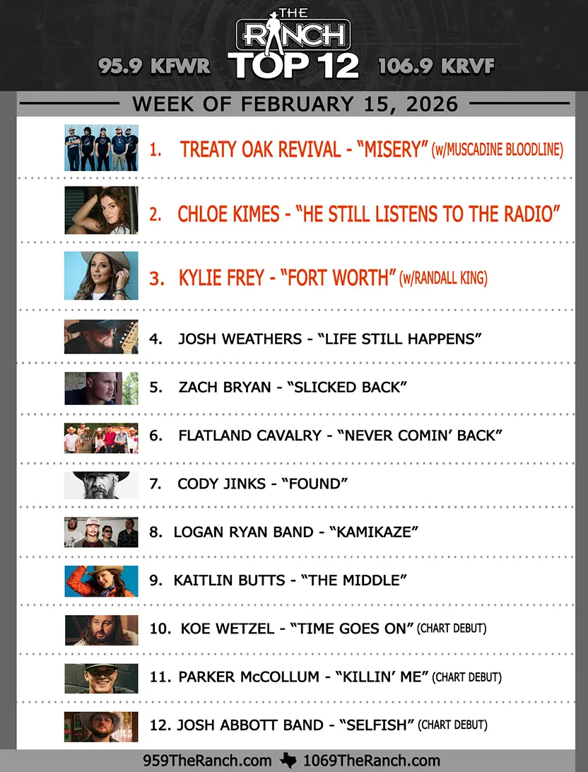 Join Heather Anderson every Sunday from 9-10 AM as she counts down the Top 12 songs each week on the Ranch Music Chart brought to you by Insurance 4 U 4 Less. 106.9 The Ranch is your home for Texans, Outlaws and Legends and this show highlights the biggest and the best of The Ranch playlist each week.