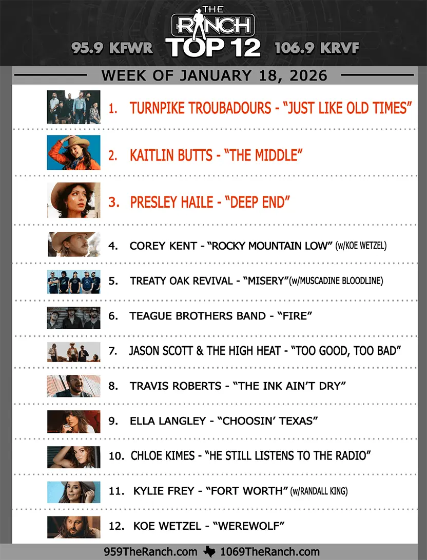 Join Heather Anderson every Sunday from 9-10 AM as she counts down the Top 12 songs each week on the Ranch Music Chart brought to you by Insurance 4 U 4 Less. 106.9 The Ranch is your home for Texans, Outlaws and Legends and this show highlights the biggest and the best of The Ranch playlist each week.