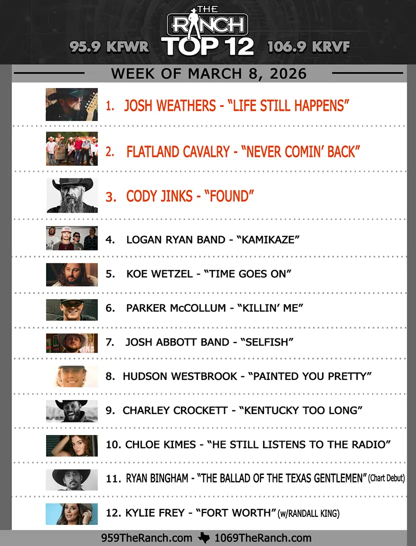 Join Heather Anderson every Sunday from 9-10 AM as she counts down the Top 12 songs each week on the Ranch Music Chart brought to you by Insurance 4 U 4 Less. 106.9 The Ranch is your home for Texans, Outlaws and Legends and this show highlights the biggest and the best of The Ranch playlist each week.